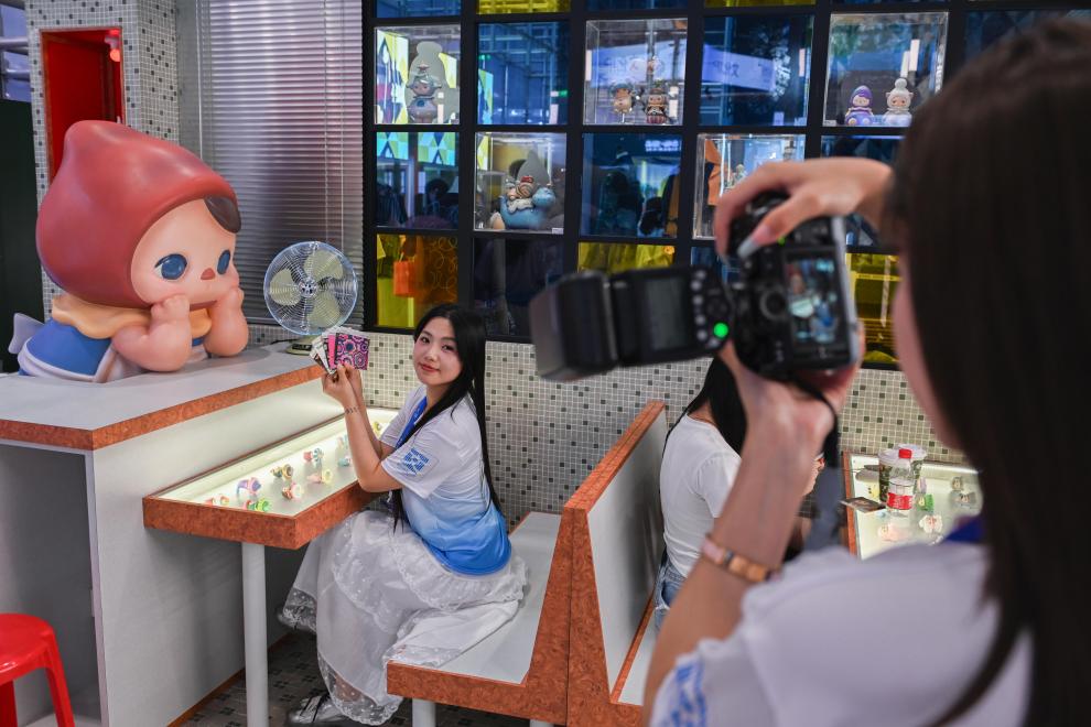 5月22日,观众在文博会香港展区泡泡玛特主题港式茶餐厅打卡拍照。新华社记者肖恩楠摄