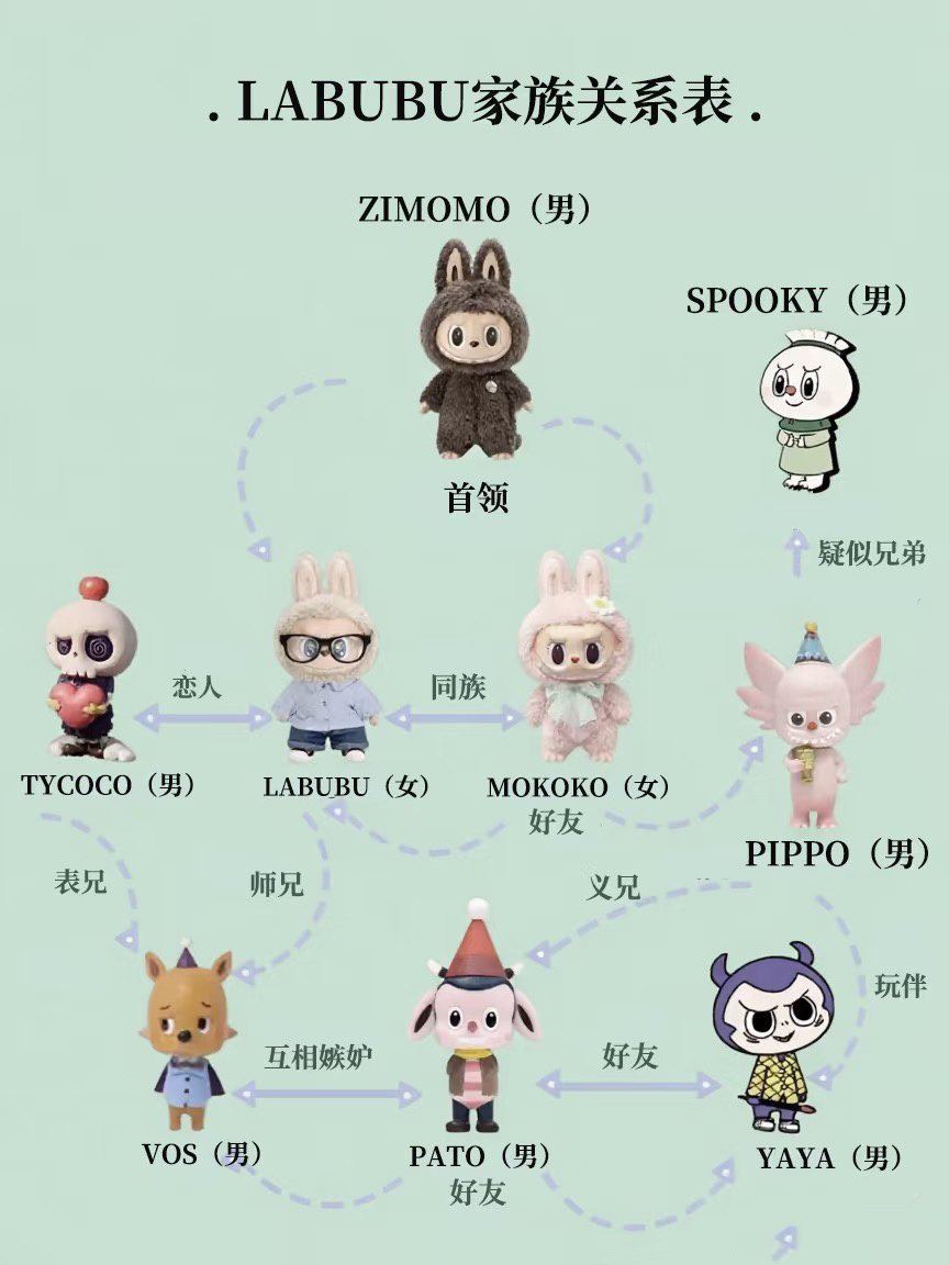 LABUBU是中国香港艺术家、泡泡玛特签约艺术家龙家升创作的北欧森林精灵形象,是其笔下THE MONSTERS精灵天团的成员。LABUBU系列拥有着庞大的家族族群,大首领ZIMOMO、成员MOKOKO、TYCOCO、YAYA、SPOOKY、PATO等。
